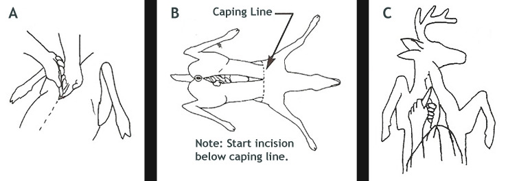 NOTE: Because of the various diseases that wild game can transmit to humans, always use extreme caution when handling the carcass. Use rubber or latex gloves and thoroughly wash your hands with soap and water after handling.