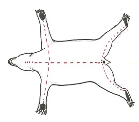 The flat incision is used for rug mounts and for a variety of poses. The ar3eas to be cut are shown in Figure 1. Make these slits (cutting the feet free from the carcass) and pull the skin off the carcass. The head is detached as with the shoulder mount.